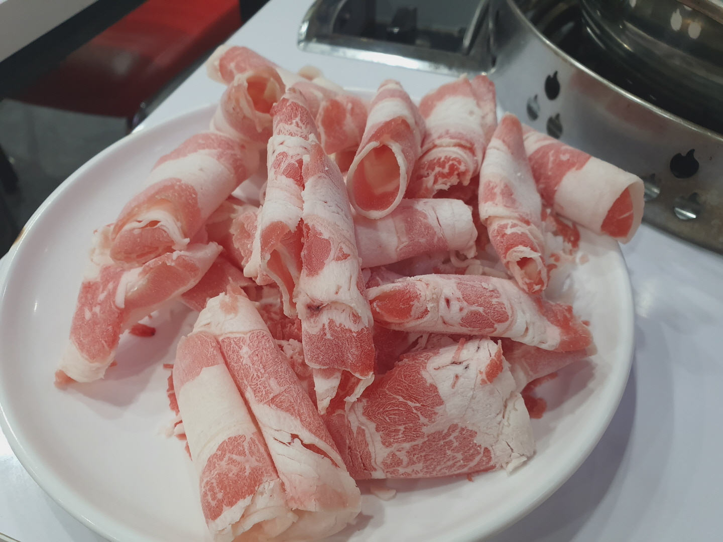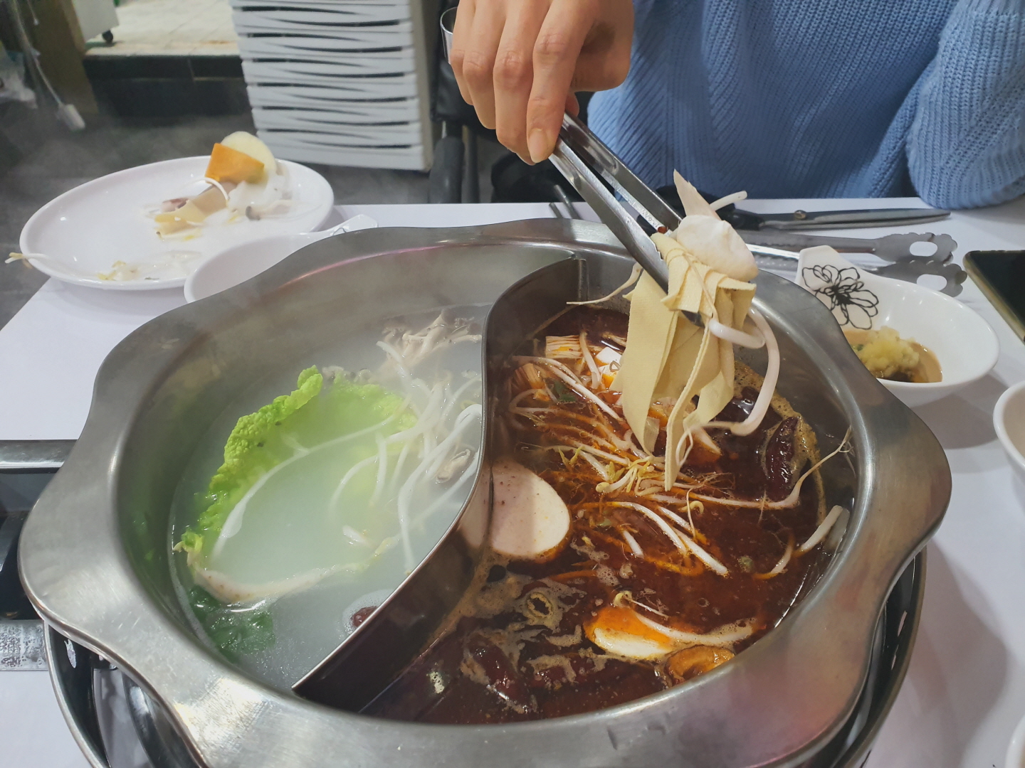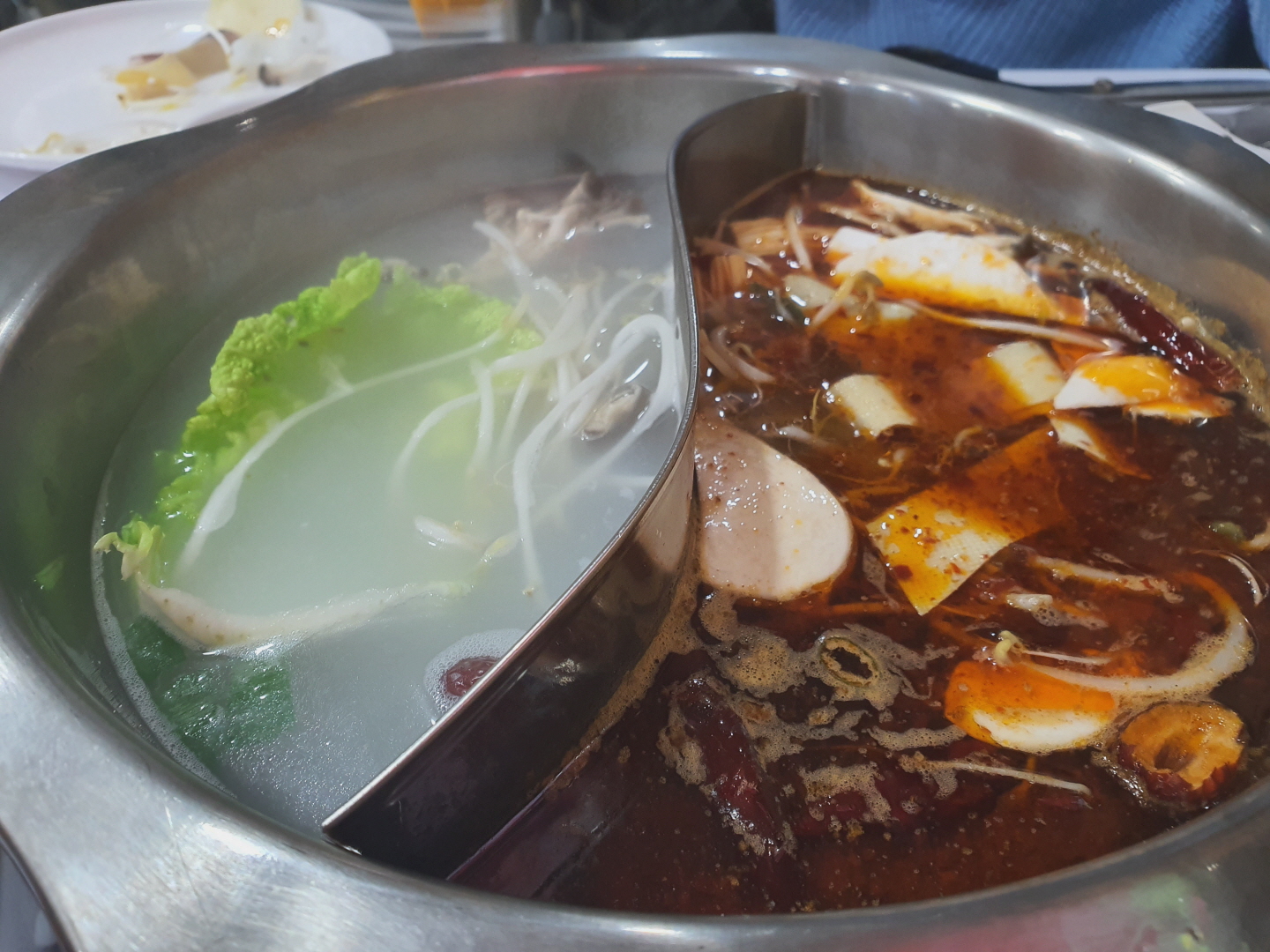 중국인으로 보이는 친절한 직원분의 설명에 따라 육수는 매운맛, 순한맛 반반으로 되어있는 원앙궈를 선택했어요. 태극 모양같은 냄비에 빨간색 육수와 흰색 육수가 반반씩 나왔습니다.