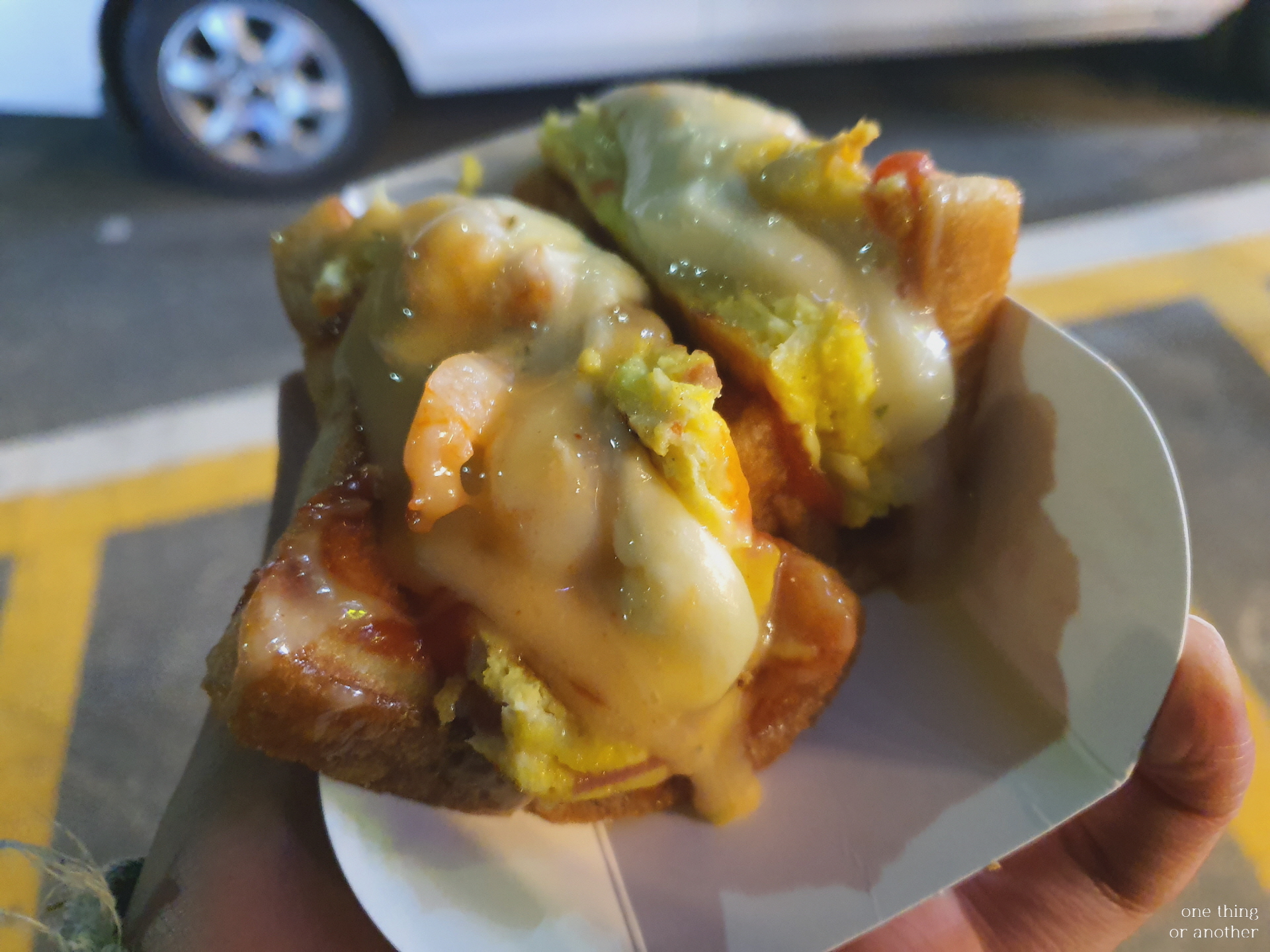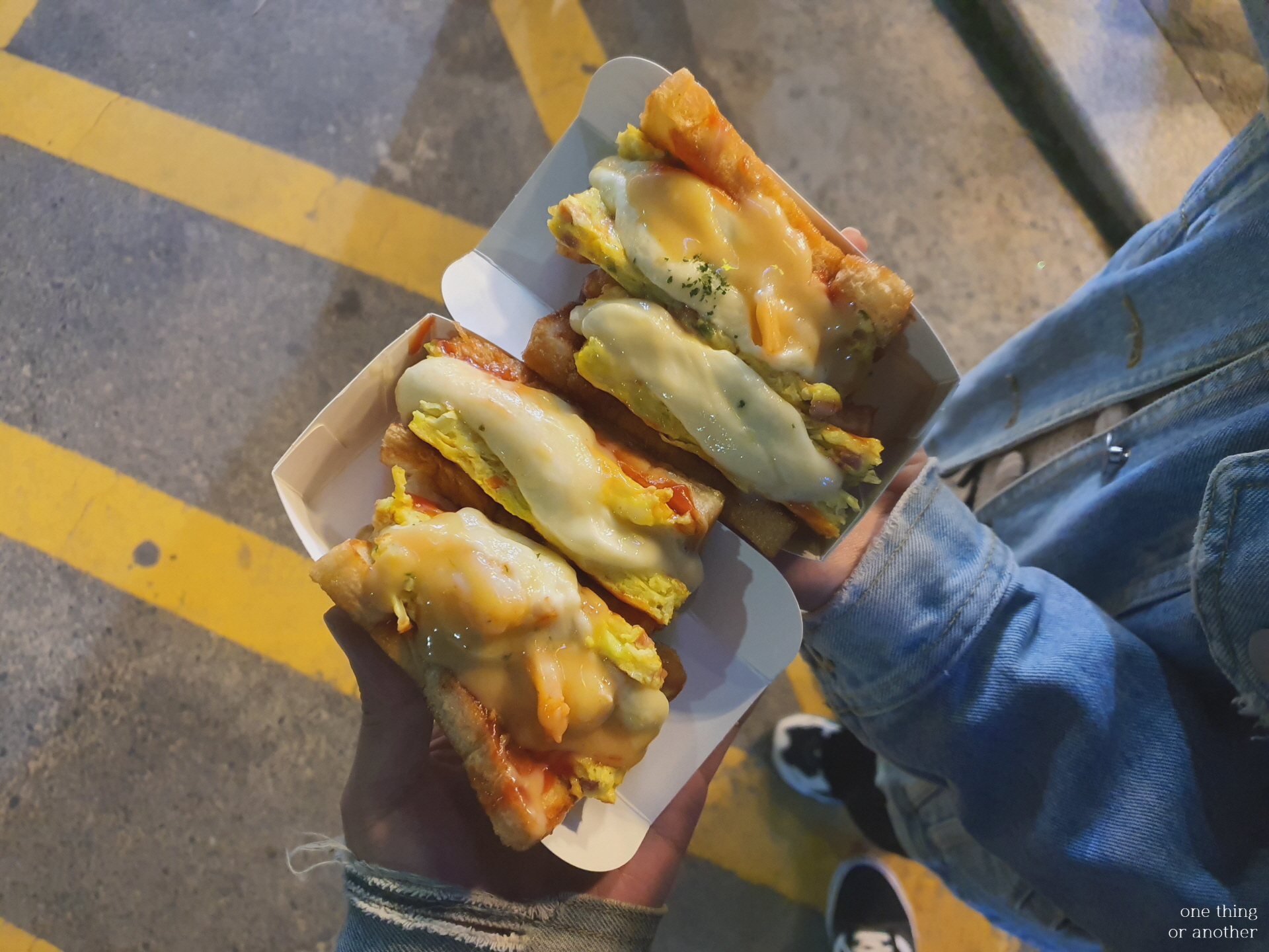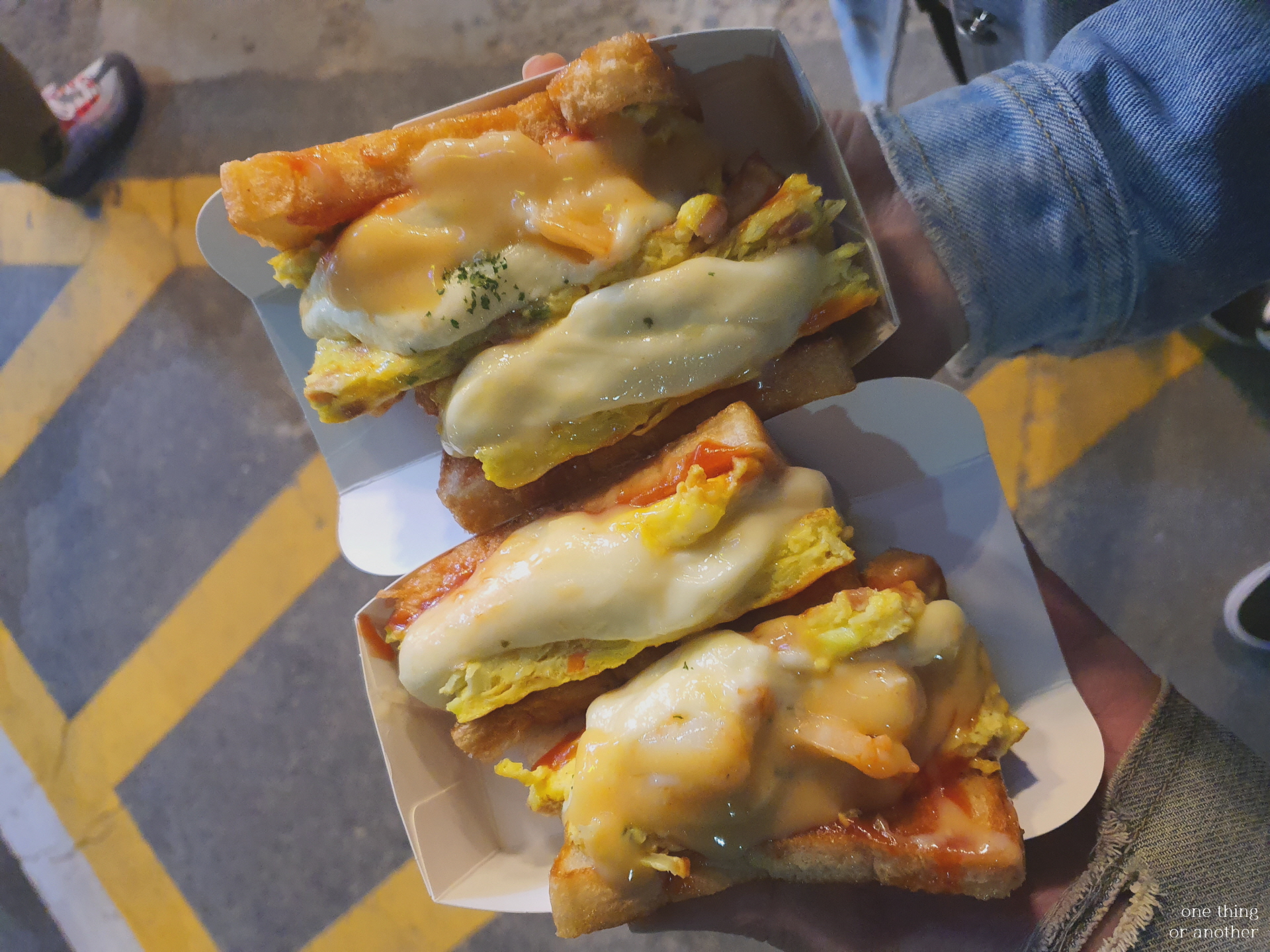주문한 토스트가 나왔습니다. 반씩 나눠서 담을건지 물어보시길래 그렇게 해달라고 하니 모짜렐라치즈와 치즈먹은 새우 토스트를 반쪽씩 담아서 주셨어요. 2명이서 메뉴를 나눠먹기에 좋았던 것 같습니다. 치즈가 듬뿍 들어간 토스트의 비주얼만 봐도 엄청 맛있어 보였어요.
