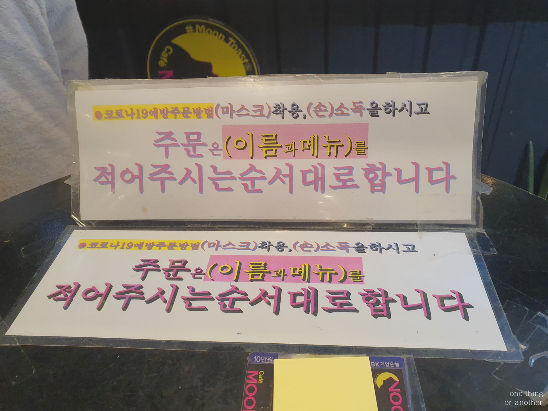 코로나19로 인해 주문할 때는 구비되어 있는 메모지에 이름과 메뉴를 적어서 직원분께 드리면 됐어요. 제 차례가 오면 이름을 불러준답니다.