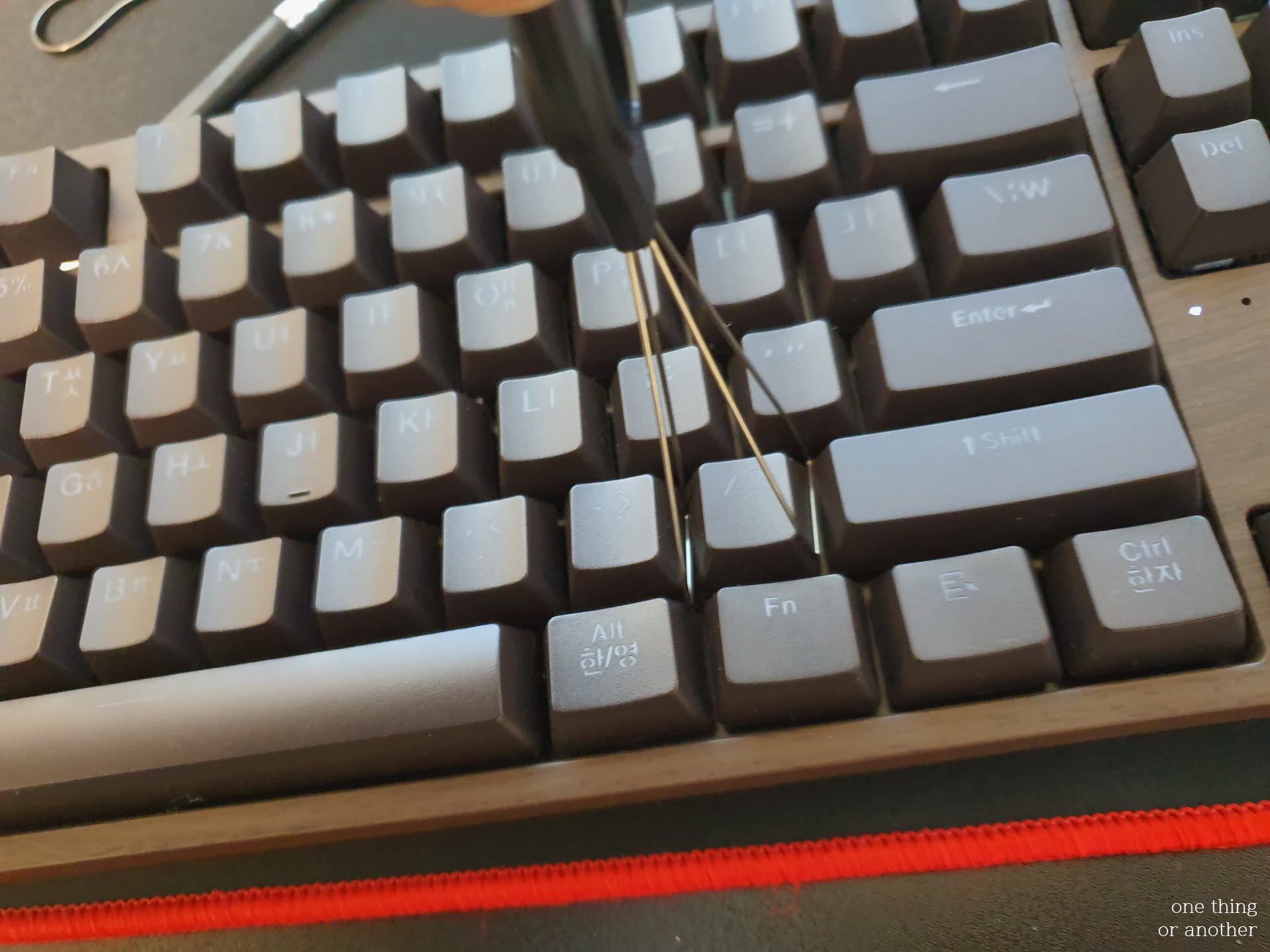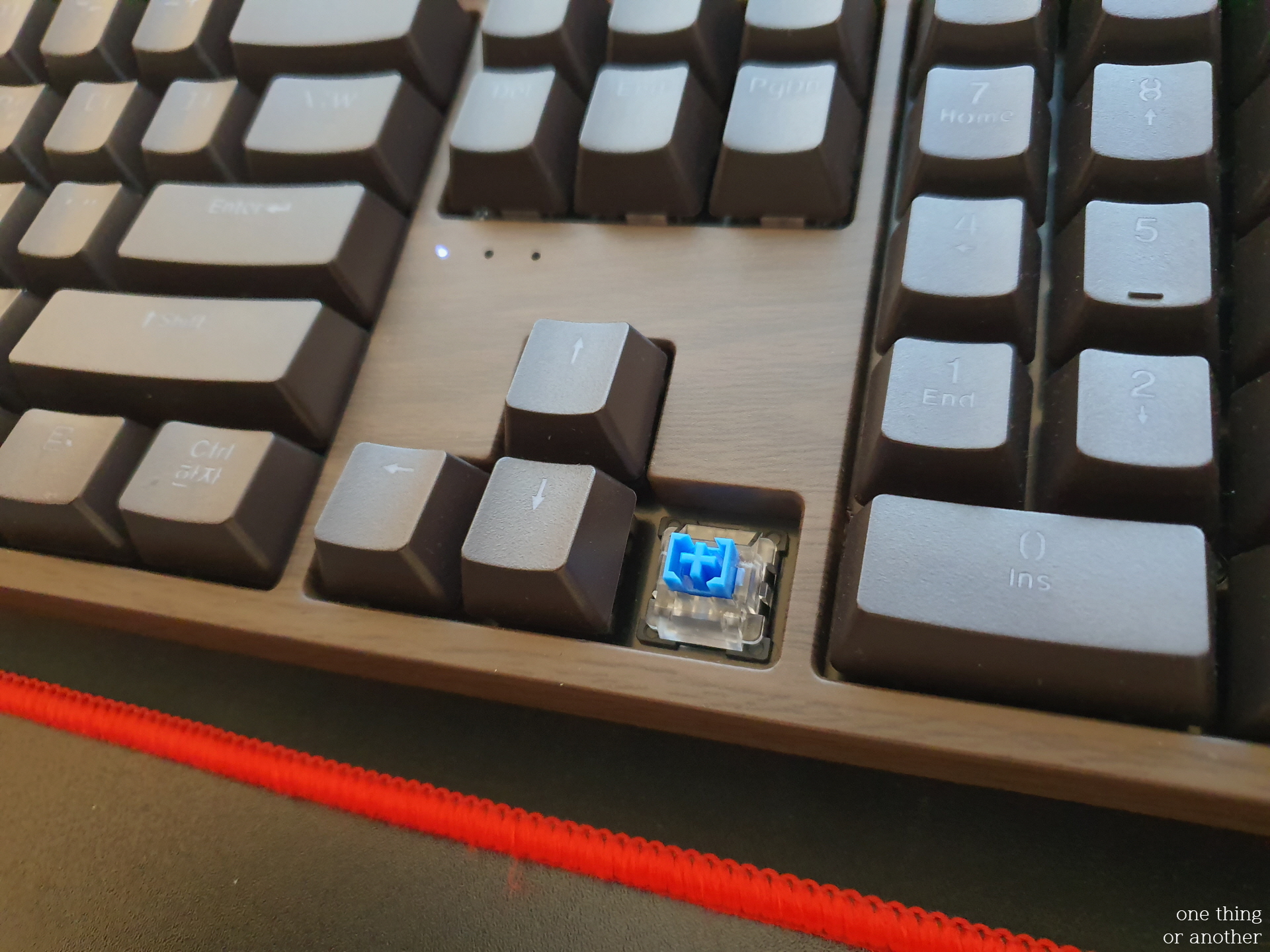 구성품에 함께 들어있던 리무버로 키캡을 제거해보니 청축의 접점이 보입니다. 청축은 타건감이 가벼운 감이 있고, 너무 소리가 경쾌하게 나서 청축보다는 적축이나 갈축을 선호하는 편이긴 한데, 또 몇일 사용하다보니 적응이 되었는지 타자를 치는게 나름 재밌습니다.