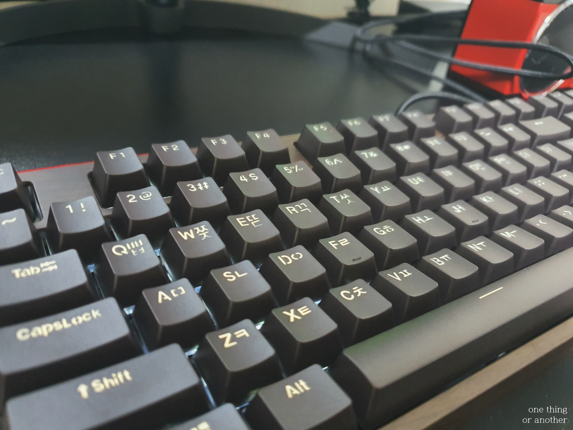 전체적으로 키보드는 마음에 듭니다. 응답속도도 빠른 것 같고, IP68등급 방수지원에, 무한키동시입력, 거기다 1년 무상보증 서비스도 지원하니 이 정도 가격이면 충분히 가성비가 뛰어나다고 말할 수 있을 것 같아요. 다만, 담점이라고 해야할지 한가지 아쉬운 점이 있다면 타자를 칠 때 한번씩 '팅팅'거리는 스프링 튀는 소리가 들립니다. 아주 미세한 소리라고는 하지만 예민한 사람에게는 충분히 거슬릴 수 있을 겉 같아요.