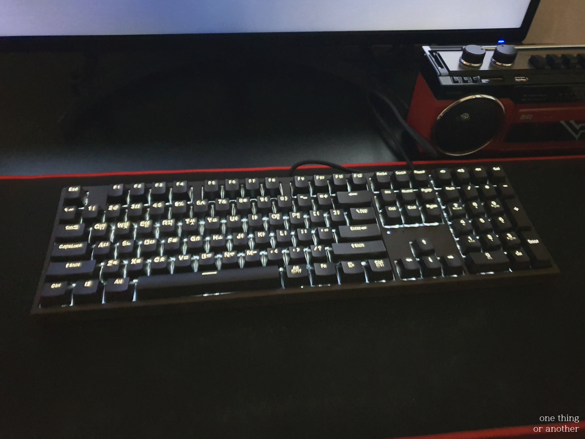 보통 기계식 키보드의 경우 백라이트가 RGB로 여러가지 색을 지원하는 경우가 많은데, 이 제품의 경우 화이트 단색의 백라이트만 지원합니다. 흰색보다는 베이지나 아이보리색 계열의 백라이트 같아요. 집에서 사용하는거라서 이런 깔끔한 색이 더 좋았습니다.