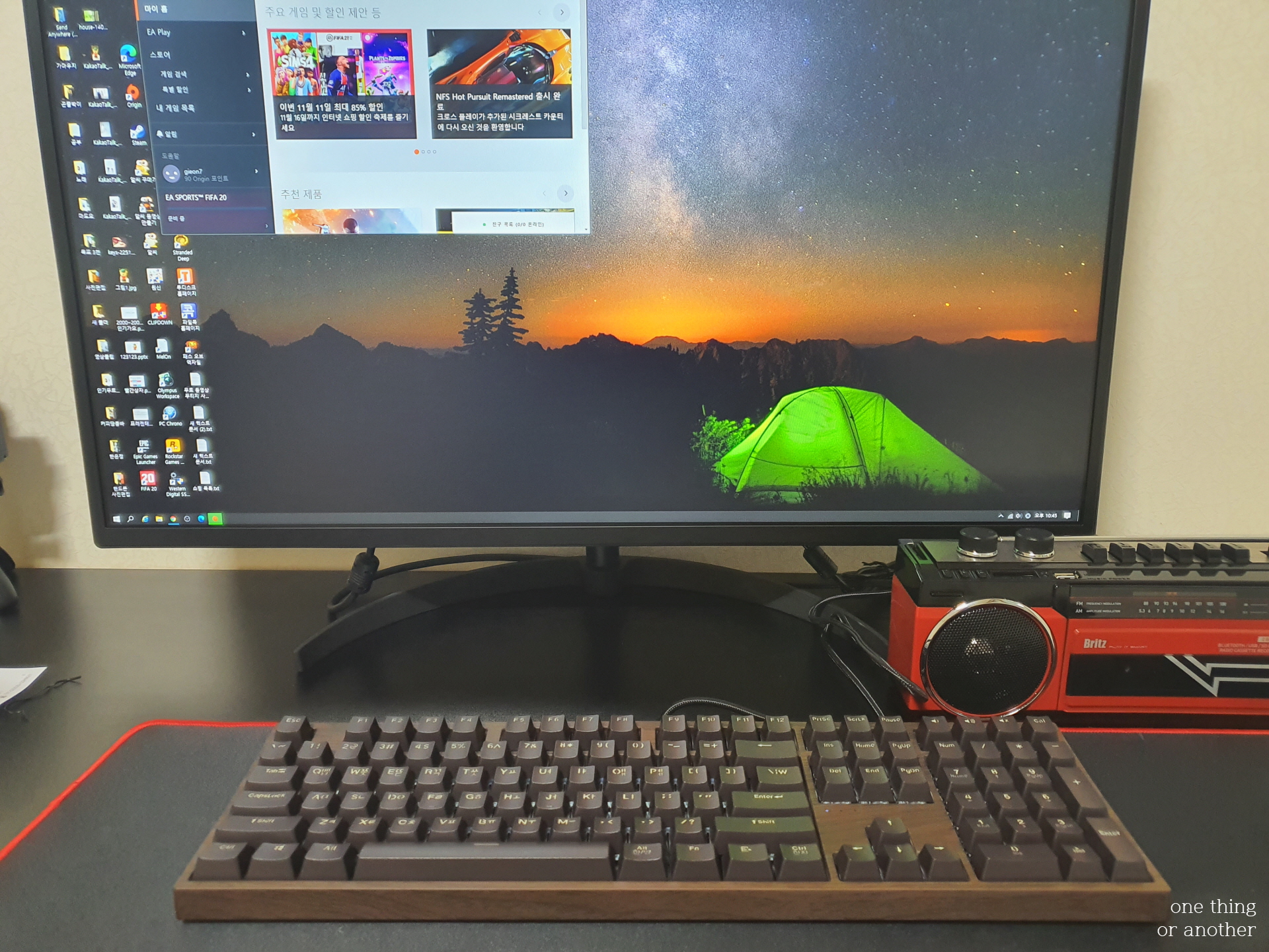 어두운 우드 디자인에 다크브라운색 키캡이 조화된 키보드 디자인이 생각보다 괜찮더라구요. 흰색 키캡처럼 색이 쉽게 변할 것 같지도 않고, 완전 검정색처럼 먼지 쌓이는 것도 티가 많이 나지 않아서 좋았습니다.