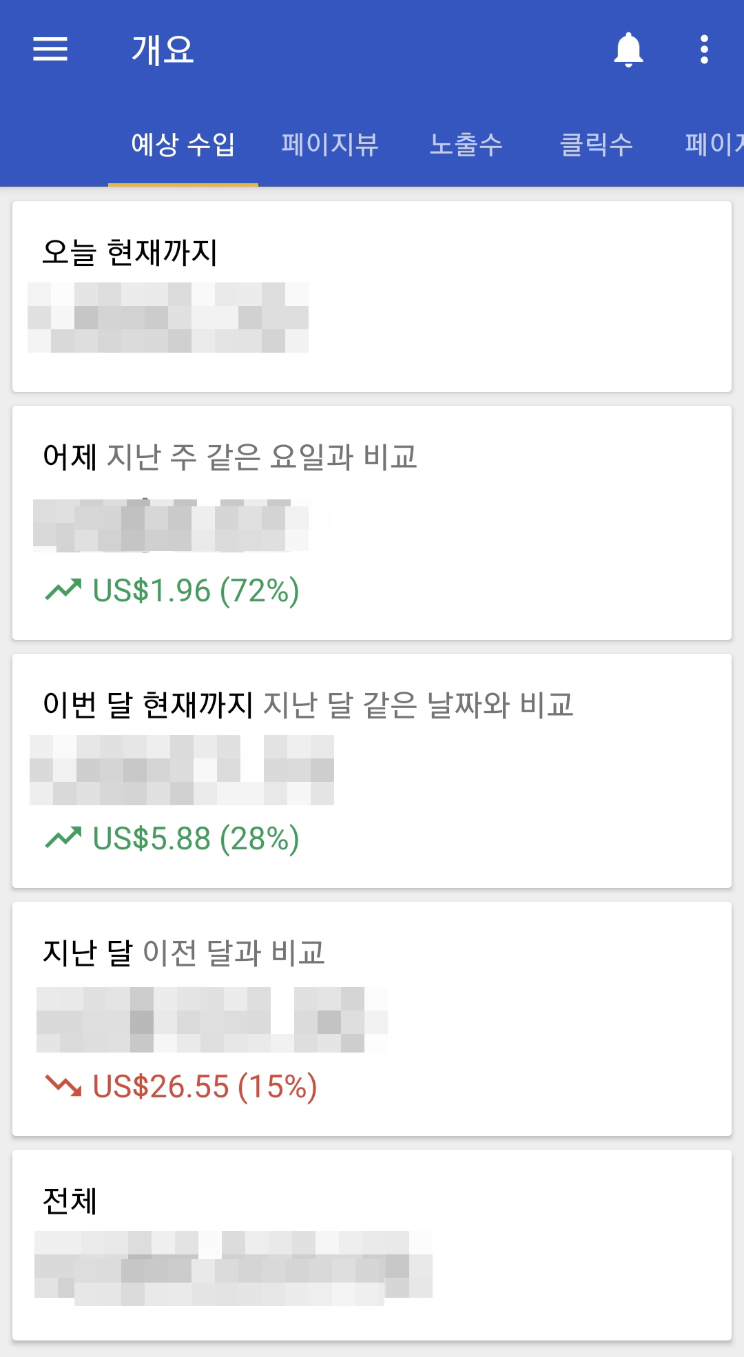 개인적으로 애드센스 어플리케이션을 이용하면, 광고 수입이나 페이지뷰, 클릭수, RPM, CPC 등의 수치를 한눈에 보기 편하기 때문에 하루에도 몇번씩이나 확인하고 있습니다.