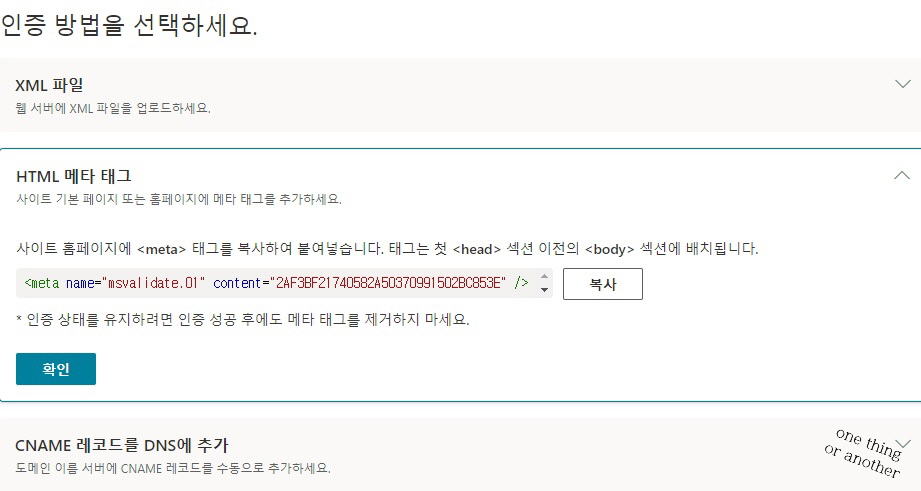 수동으로 사이트 등록을 진행할 경우에는 네이버 웹마스터도구, 구글 서치콘솔과 마찬가지로 사이트 소유 인증단계를 거쳐야합니다. 마찬가지로 HTML 메타 태그를 복사해서 스킨 편집에 붙여넣는 방식으로 사이트 소유 인증을 하면 됩니다.