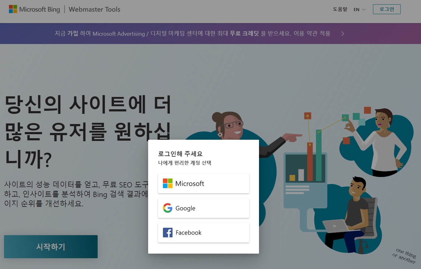 먼저, 빙 웹마스터도구 사이트인 빙 웹마스터 툴스(Bing Webmaster Toos)에 접속합니다. 다음으로 로그인이 필요한데, 마이크로소프트나 구글, 페이스북 아이디로 사용이 가능합니다. 빙 웹마스터도구는 구글 서치콘솔과 연동하여 서치콘솔에 등록된 내 사이트 정보를 그대로 옮겨오는 것이 가능합니다. 그래서 저는 일단 구글 아이디로 로그인을 해주었어요.