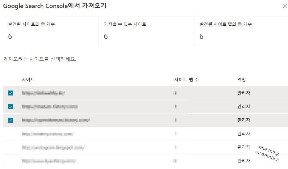 다만, 서치콘솔에 등록되어 있는 모든 사이트가 뜨지는 않더군요. 왜 그런 것인지는 모르겠지만 '구글 서치 콘솔에서 가져오기'를 통해서 발견되지 않은 사이트는 수동으로 등록을 해주었습니다.
